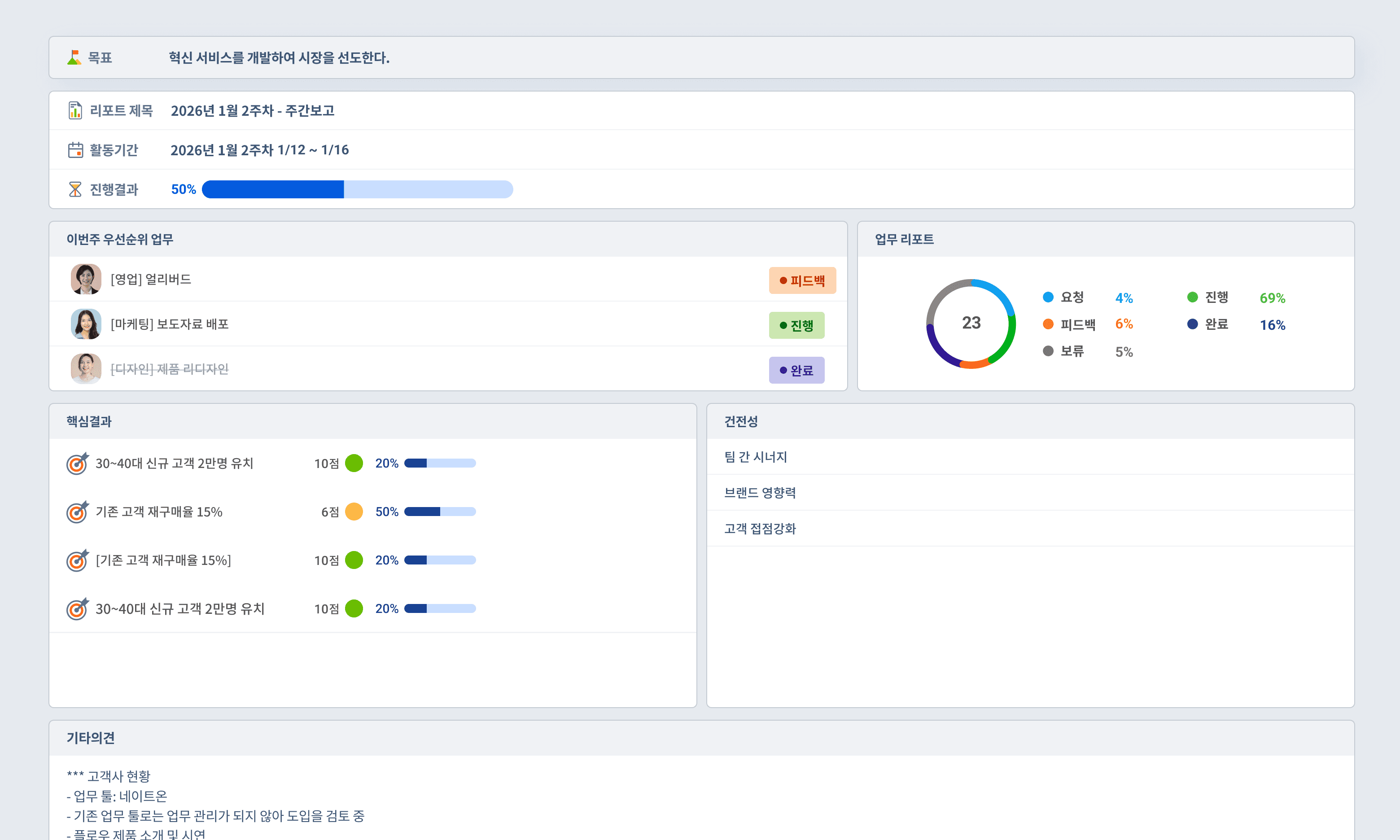 한 주간의 업무를 OKR 목표별로 자동 집계하여 제공합니다.