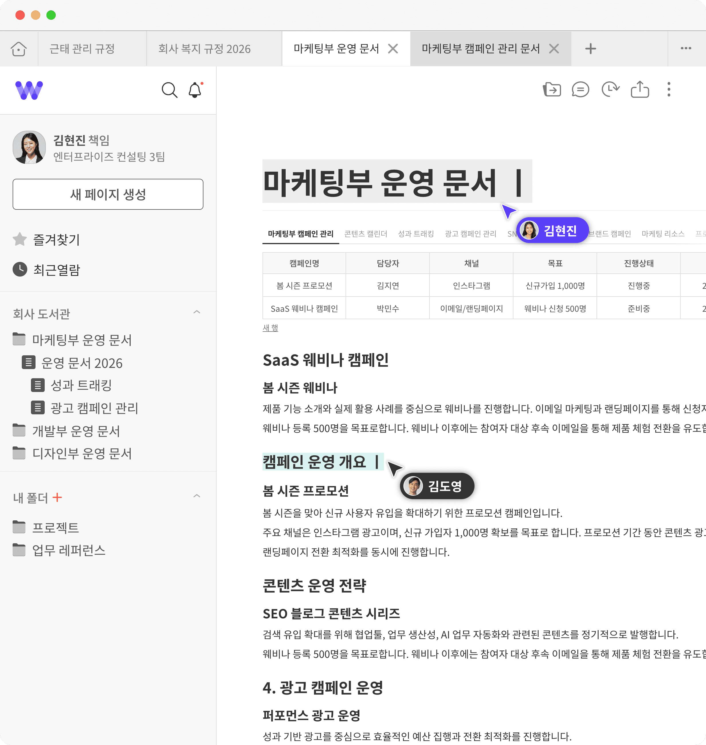 팀원들이 어디에 있든 마치 한 공간에 있는 것 처럼 함께 문서를 작성하세요. 실시간 타이밍 커서와 동기화로 중복 작업 없는 완벽한 소통을 보장합니다.