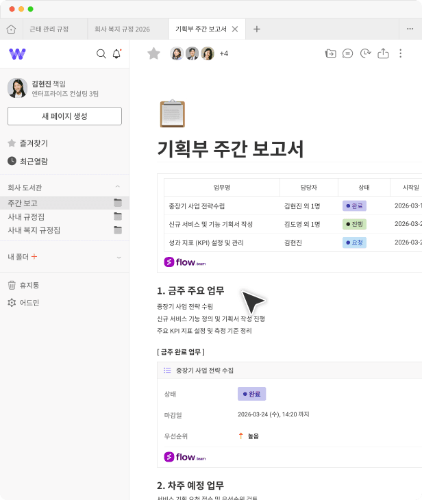 작성과 동시에 팀원이 확인하고 실시간으로 합의하는 워크 플로우를 경험하세요. 작성 중인 문서에 즉각적인 피드백을 반영하여 의사결정의 속도와 정확도를 극대화합니다.